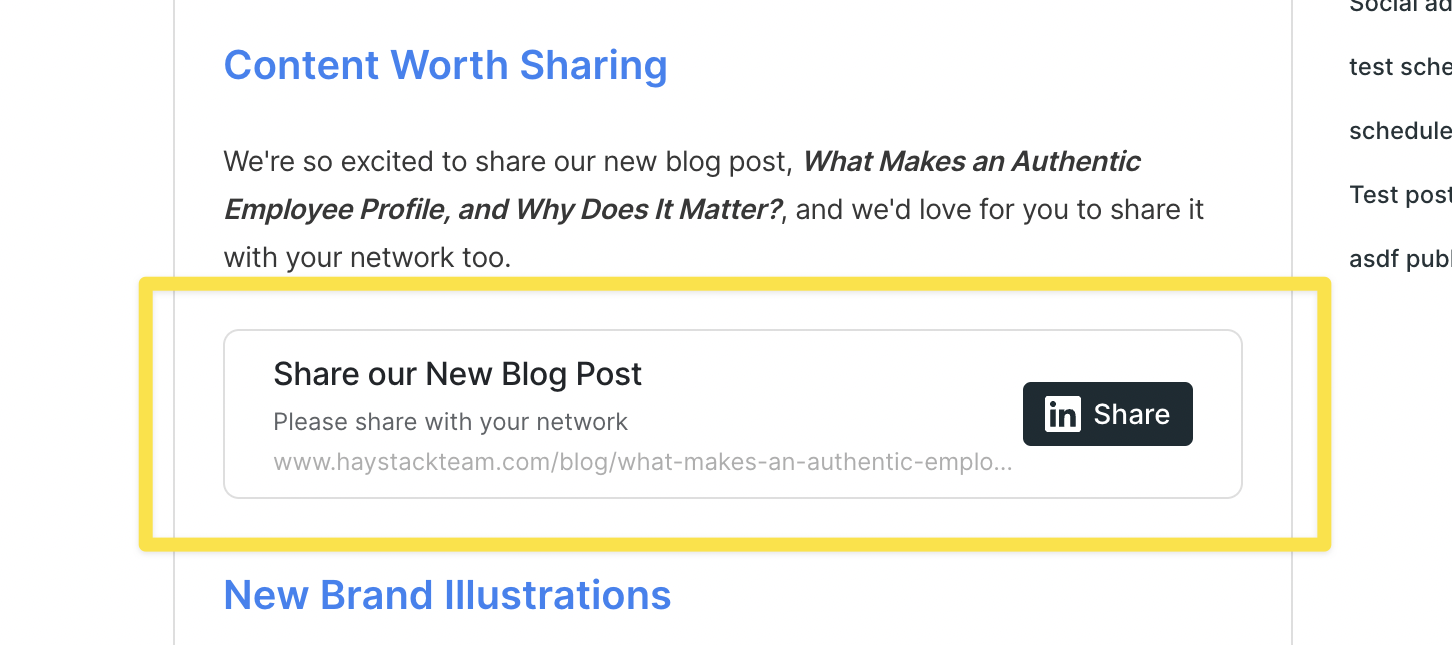5. Click Save, and you’ll see the beautiful social advocacy card added right into your content.