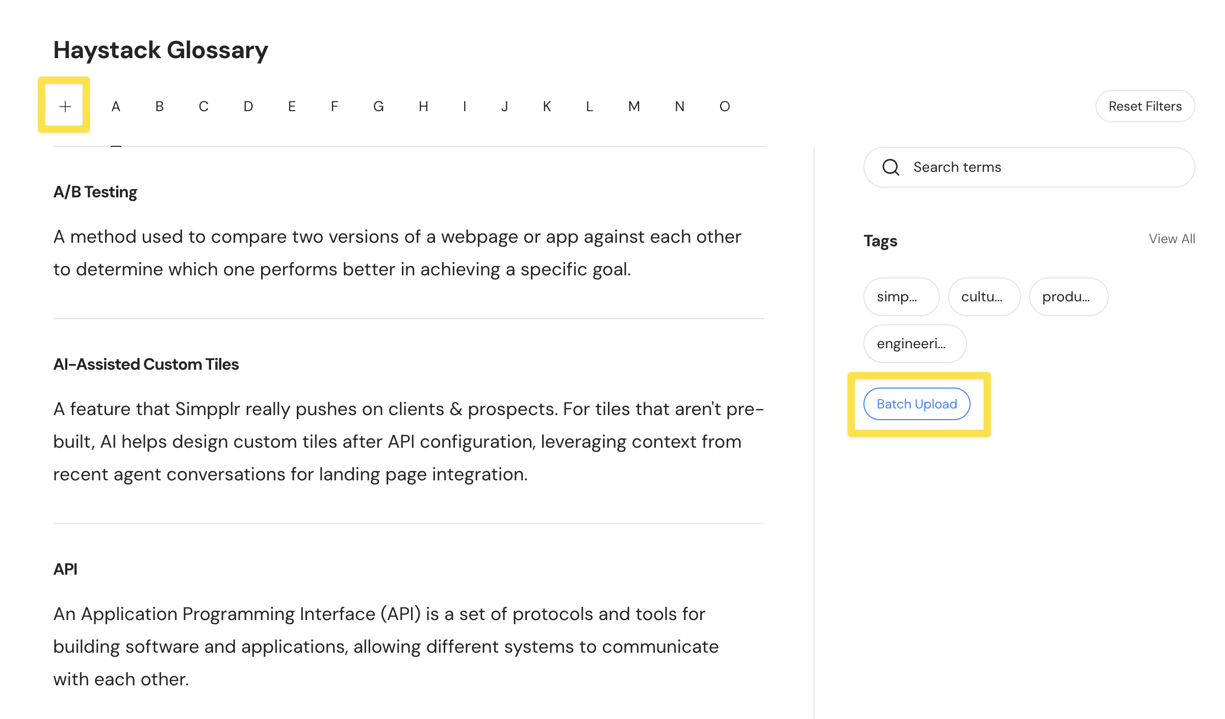 Keywords: Glossary, Company Jargon, Acronyms, Onboarding, Batch Upload, Knowledge Management, Internal Lingo, Search Indexing, Workspace Navigation.