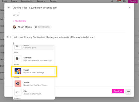 Upload your image or select one from your workspace gallery. You'll see the image added to your post! Continue editing your content as needed.