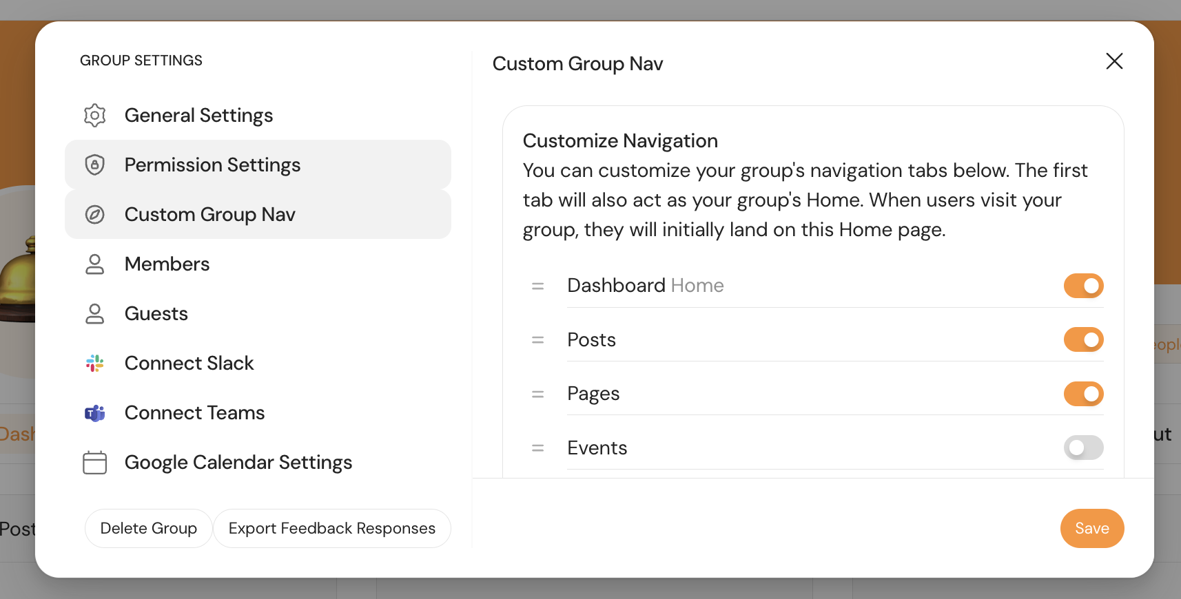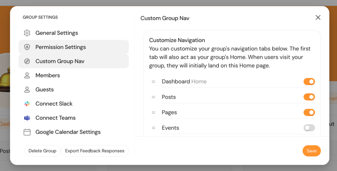 Reorder Tabs: Drag and drop the tabs to change their sequence. The top-listed item in this menu will become the Home (landing page) for your group.