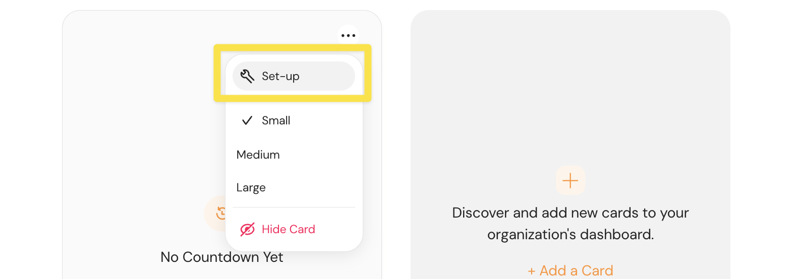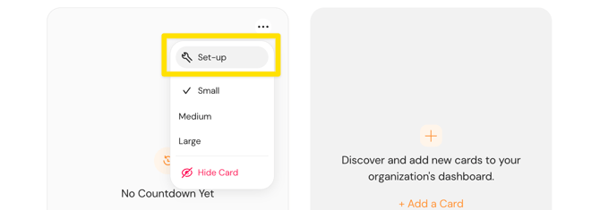 To set up a card once it's on your dashboard, click the three-dot button in the card header. Here, you will find options for: