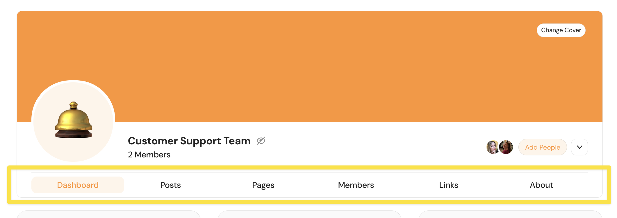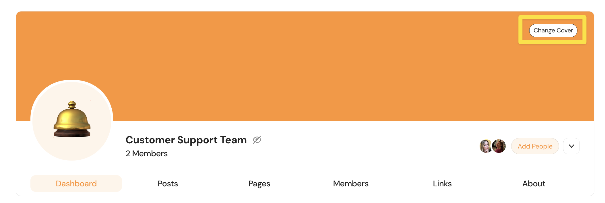 Keywords: Group Dashboard, Navigation, Cover Photo, Avatar, Custom Branding, Dashboard Cards, Group Settings, UI Customization, Unsplash, Embedding Tools