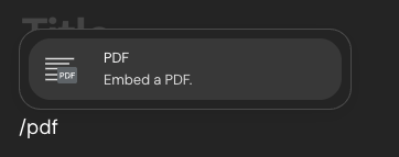 Keywords: PDF, embed PDF, upload document, file attachment, PDF viewer, share PDF, document display, content editor, slash command, internal document, policy upload, handbook, flyer, digital asset.