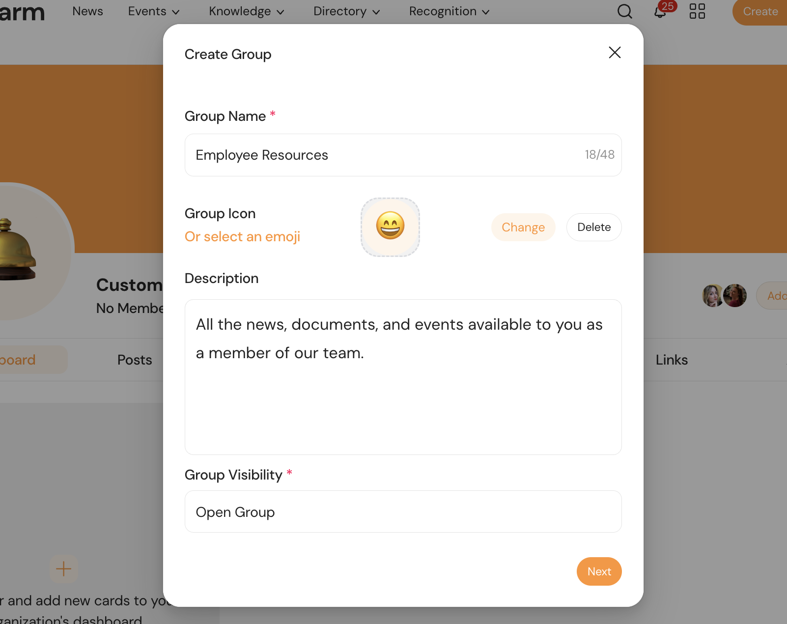 Groups are the heart of engagement in Haystack. They provide a centralized hub where specific audiences can gather to share announcements, store documentation, and stay connected. Whether it’s a formal department like "Customer Support" or an employee resources group like "Working Parents," creating a group ensures the right people have access to the right information at the right time.