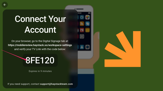 - On your TV's browser, navigate to https://workspacename.haystack.so/tv/ — replace the bold text with your Haystack workspace's URL.