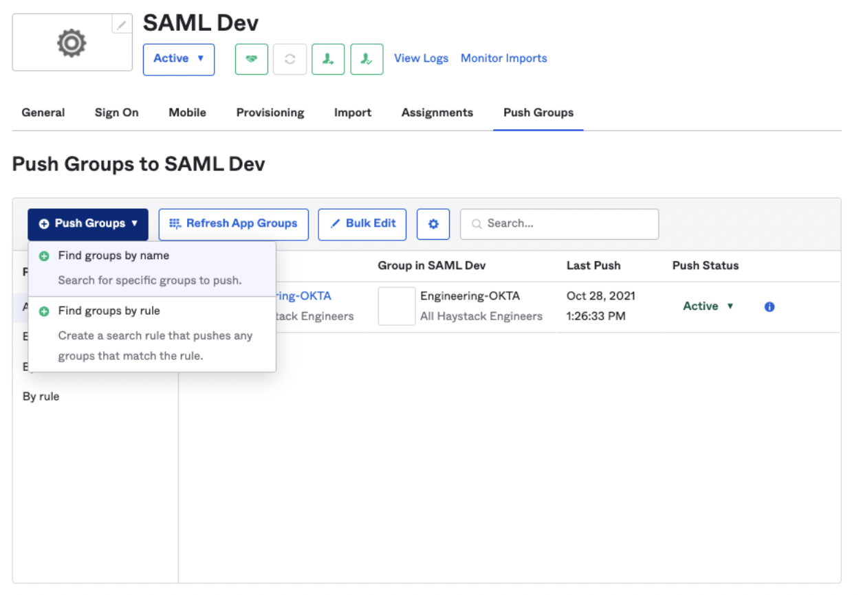 2. Under the "Push Groups" tab, select the groups you want to push from Okta to Haystack.