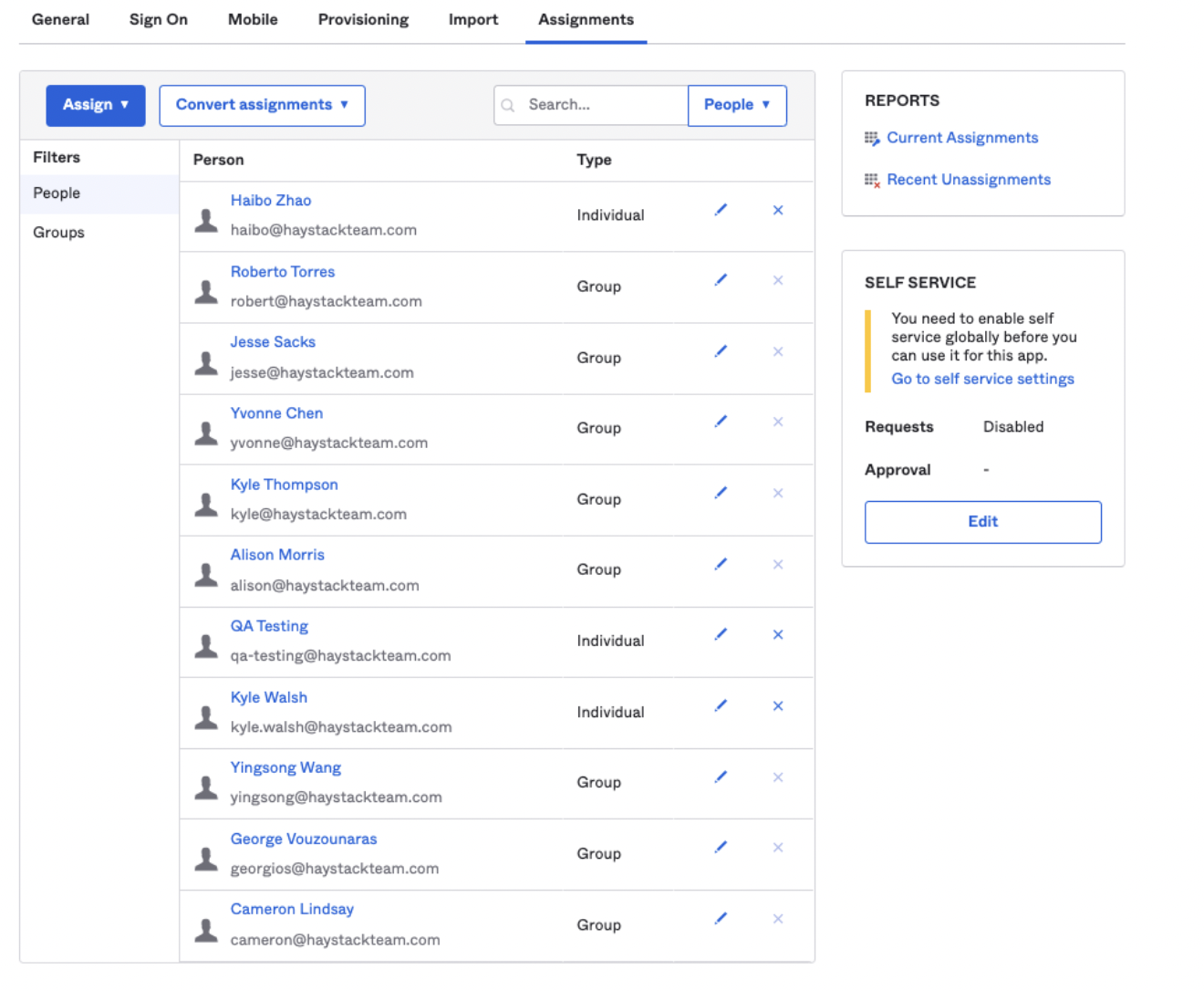 Now, head over to the Assignments tab to make sure everything is working correctly. Users and groups you've assigned will be provisioned in Haystack, and those who are un-assigned will be deactivated.