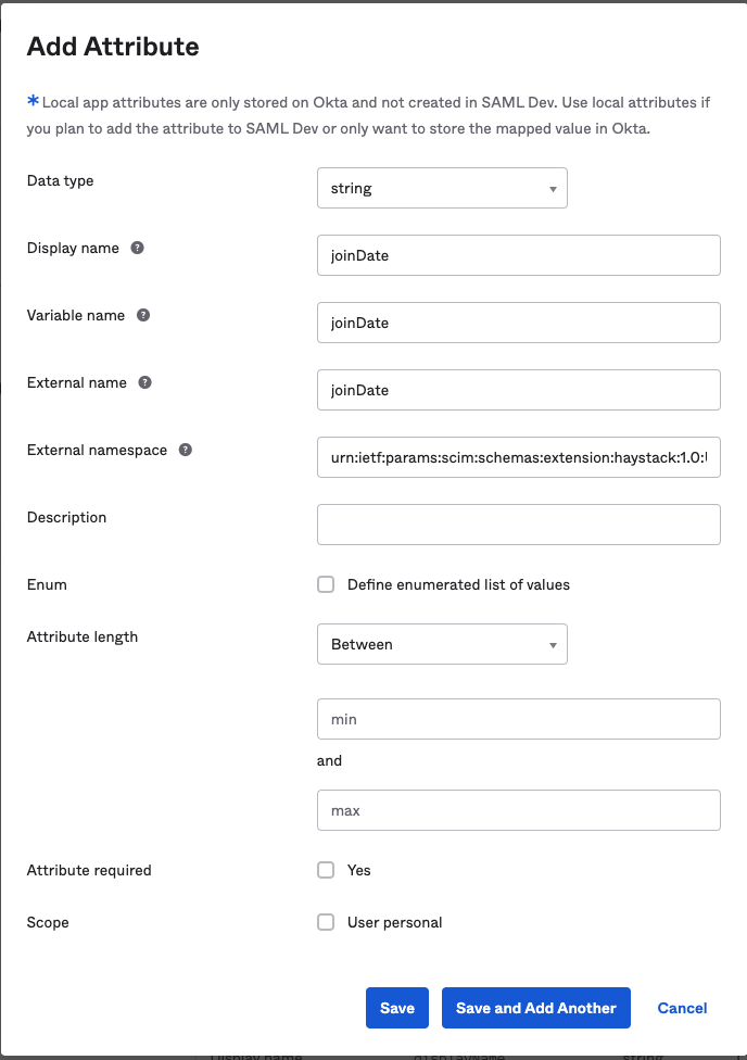 Add a new custom profile field in the Okta application for Haystack. Go to "Provisioning" -> "To App" -> "Go to Profile Editor" -> "+ Add Attribute." Be sure to use "urn:ietf:params:scim:schemas:extension:haystack:1.0:User" as the external namespace.