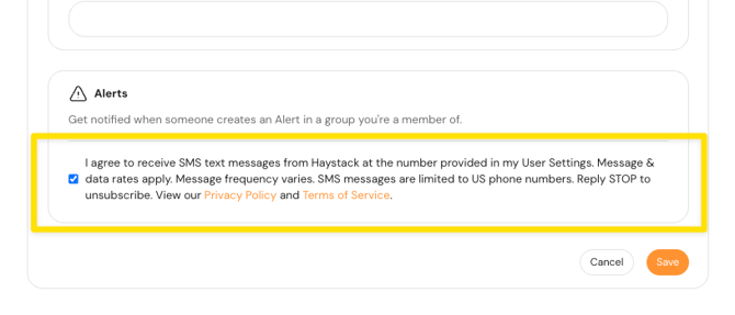 Compliance regulations require that users "opt-in" to receive automated text messages. Even if a phone number is present, an alert will not be delivered unless the user has granted permission. Opt-in must be complete by each individual user and cannot be completed by workspace admins of the Haystack team on their behalf, no exceptions.