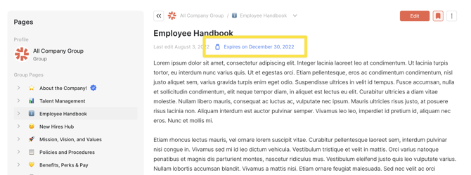 The resource page expiration date is visible to everyone who can see the page. The details will appear right at the top of the page, so your team will always know how fresh the information is!