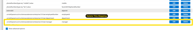 - On the Attribute Mappings list, find the default mapping for manager, which is listed as manager (Source) to urn:iet:params:scim:schemas:extension:enterprise:2.0:manager (Target).