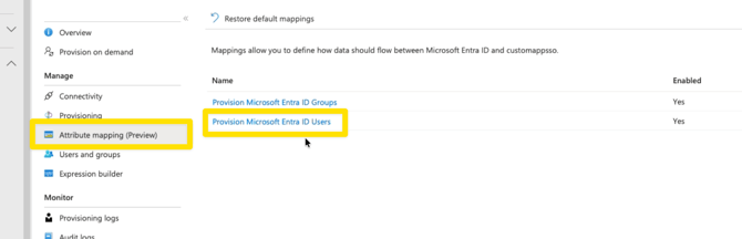 - In your Entra app, go to the Attribute mapping tab in the left hand menu.