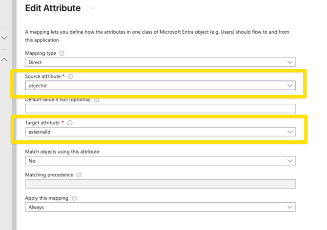 - Locate the externalID field and select Edit. Edit this field to map objectId (Source attribute) to externalId (Target attribute). This is the most vital mapping for unique identification.