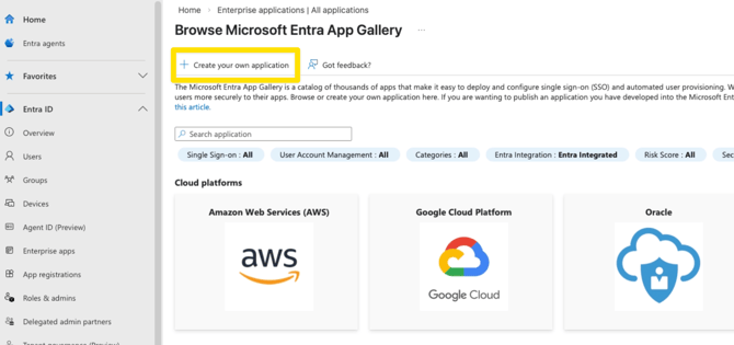 - In the Microsoft Entra portal, navigate to Enterprise Applications > New Application.