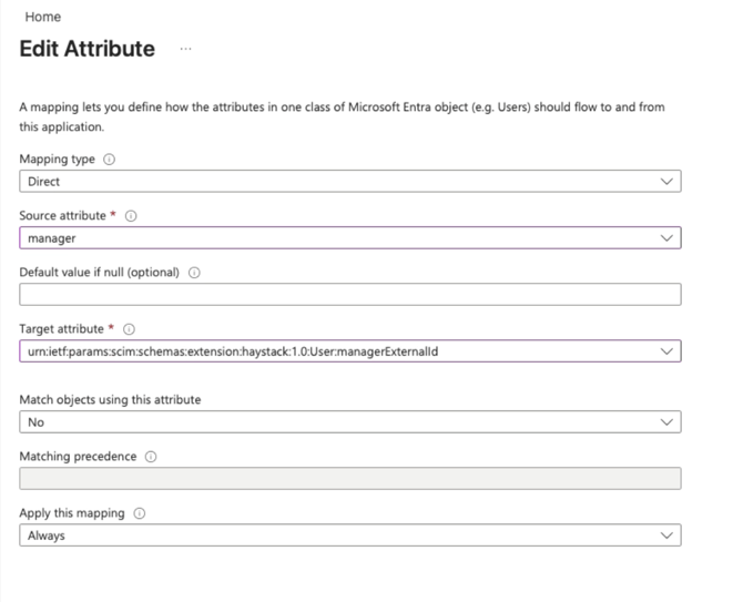 - Target Attribute: urn:ietf:params:scim:schemas:extension:haystack:1.0:User:managerExternalId