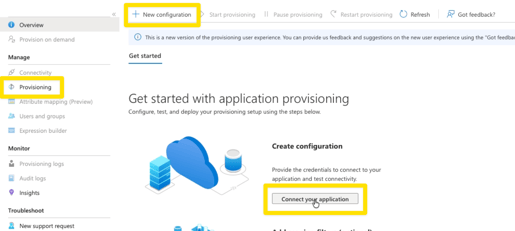 - In your new Entra app, go to the Provisioning tab in the left hand menu and click Connect your application under the “Getting Started with Provisioning” header. (If you don’t see this option, you can also select +New Configuration in the header options, which will take you through the same workflow).
