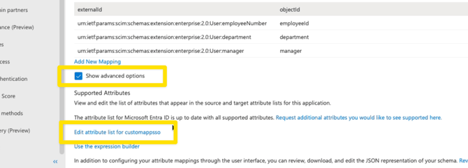 - At the bottom of your list of mappings, tick the Show advanced options box and click Edit attribute list for CustomApp.