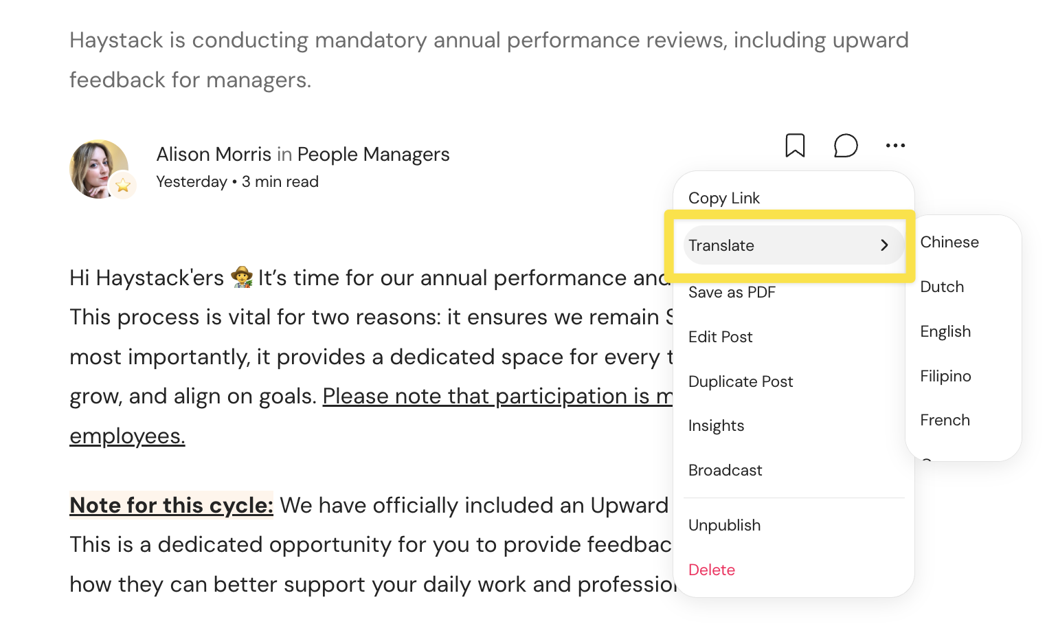 In today’s global workforce, clear communication shouldn't be limited by language barriers. Haystack provides two powerful ways to ensure every employee feels included and informed, regardless of their native tongue. Whether it’s navigating the platform menus or reading the latest CEO update, our translation tools help bridge the gap.